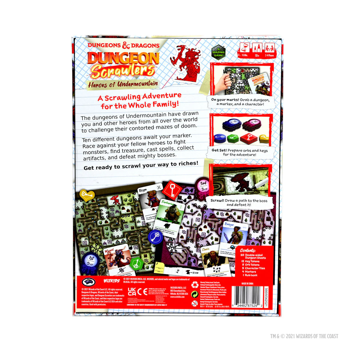 In Dungeons and Dragons: Dungeon Scrawlers: Heroes of Undermountain, you and other adventurers are drawn together to delve into Undermountain, an immense underground of dungeons created by the Mad Mage, Halaster Blackcloak. Use your markers to trace your path, defeating Monsters, casting Spells, connecting Artifact Fragments, and collecting shiny Treasure on the way! The round ends when one player defeats that dungeonās mighty Boss, so you only have a few minutes to collect as much loot as possible! The player with the most points after exploring three dungeons is the winner!