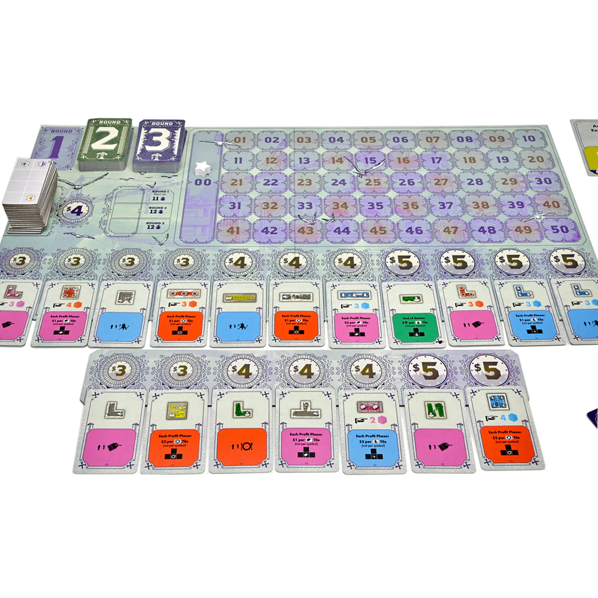 Score! Earn points for building types, upgrades, landmarks, events, and remaining cash!