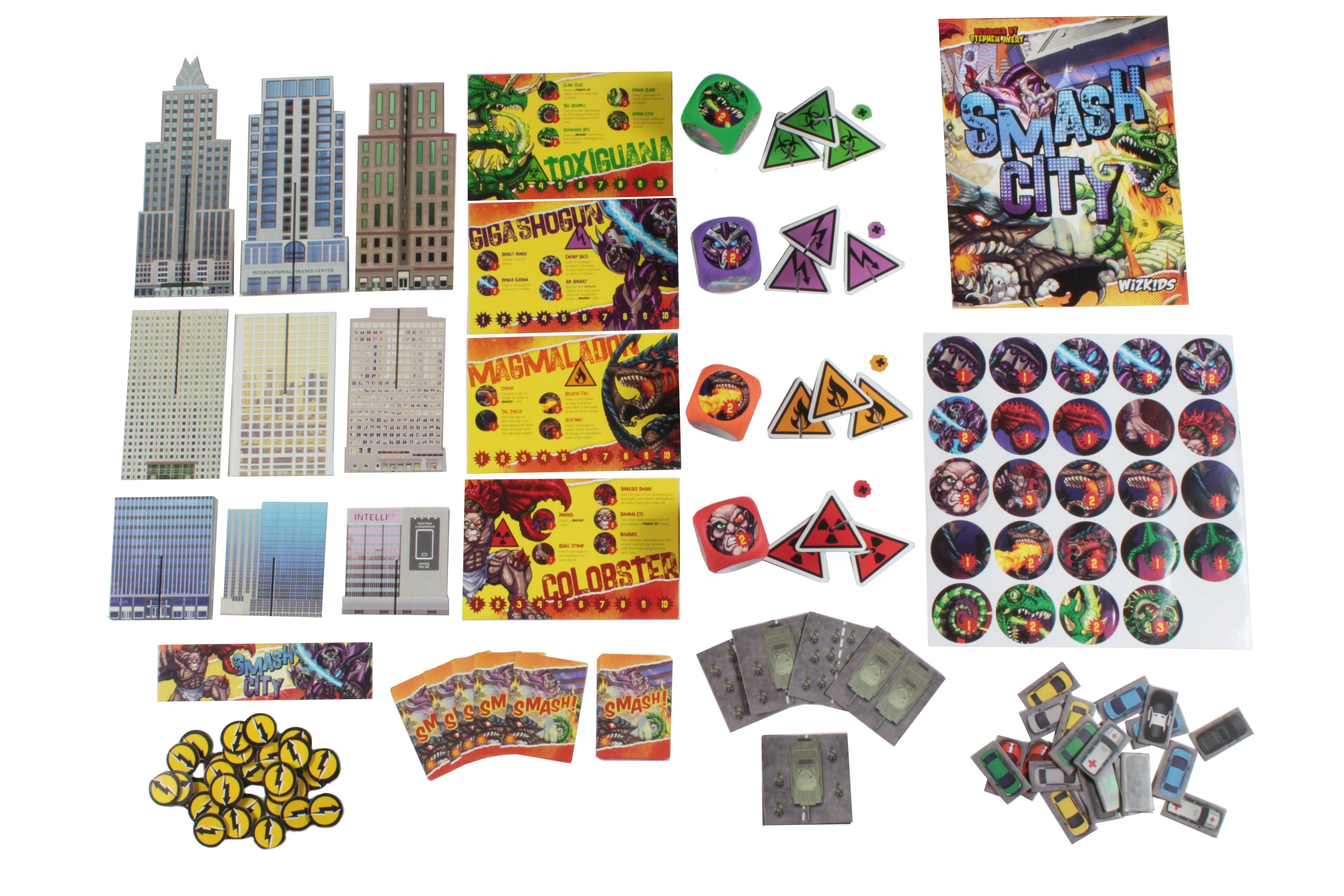 Smash City is the action-packed game of Kaiju combat! Toss your giant monster dice at your foes to perform devastating attacks! Crush cities and spread fire, electricity, poisonous gas and radiation! Throw cars and destroy tanks! Inflict maximum carnage like a true Kaiju!