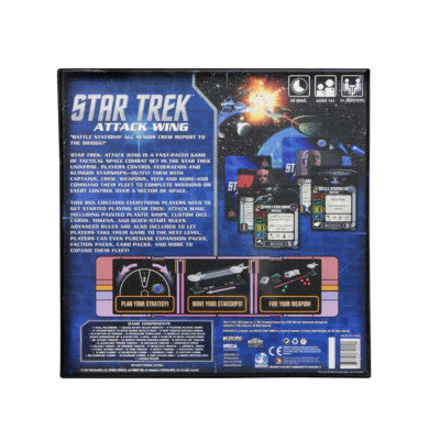 In Star Trek: Attack Wing, players select ships, crew, and upgrades from across the Star Trek universe, and set them against each other in exciting battles and thematic scenarios! This starter set includes everything two players need to start playing--highly detailed plastic miniatures, cards, dials, attack and defense dice, maneuver templates, range rulers, and dozens of tokens. It provides a deep and varied experience on its own, with two Federation starships, two Klingon starships, and enough crew and upgrades for a wide variety of matchups.